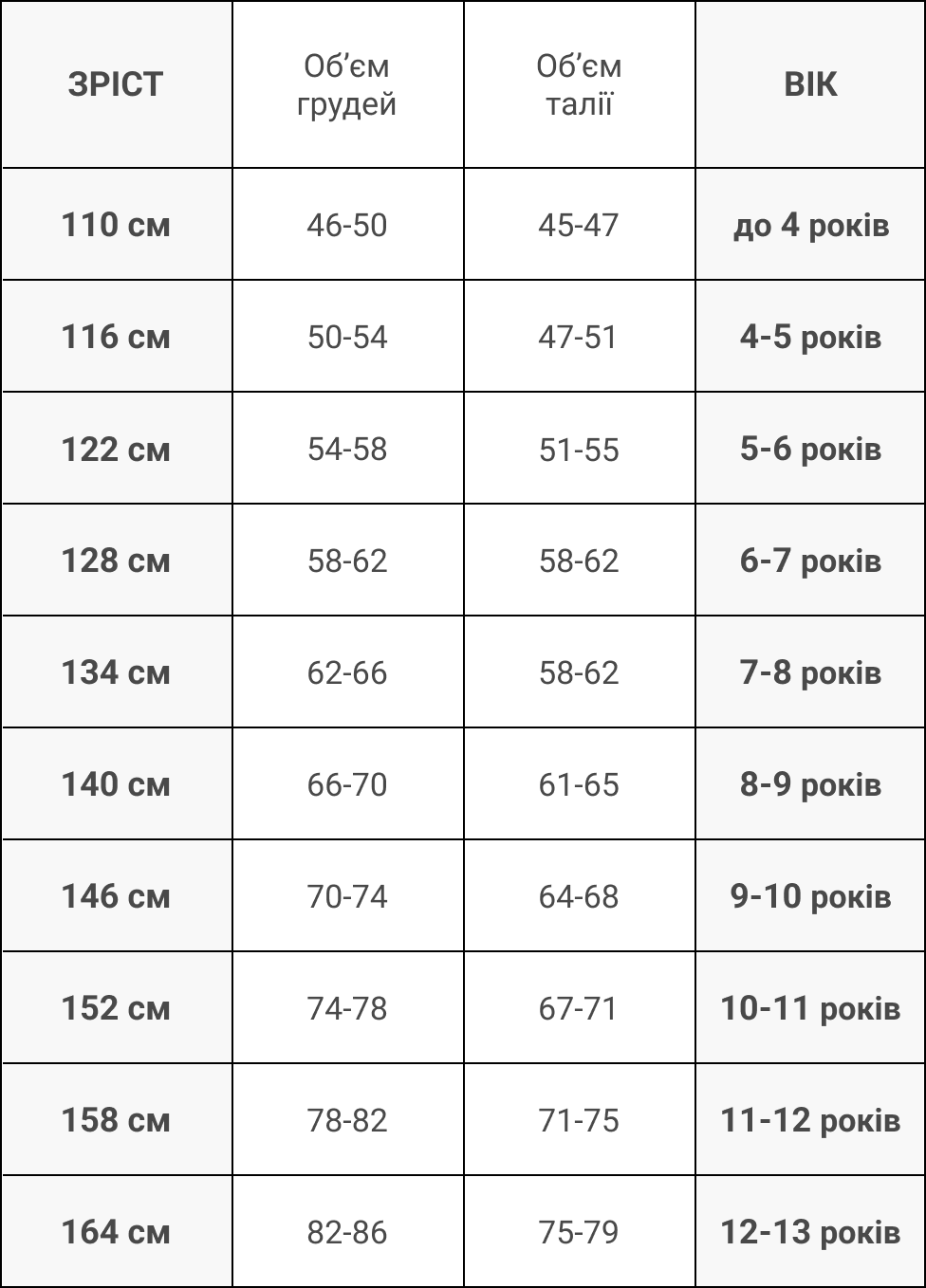 Розміри для дітей та підлітків: термобілизна доступна у розмірах на зріст від 110 до 164 см.